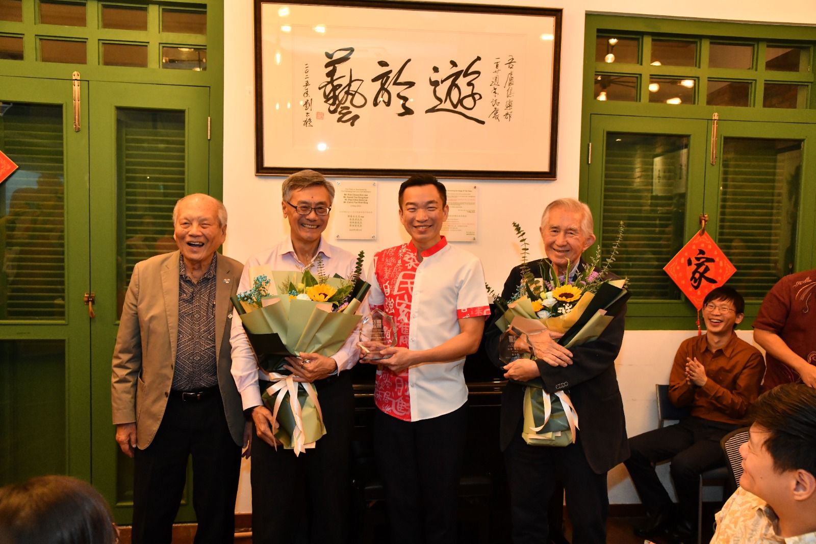 We were delighted to have Dr Liu Thai Ker and Professor Tan Eng Chye join us for the celebration, both holding bouquets (Dr Liu on the right, Prof Tan on the left), making the event truly special.